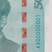 正面中部面额数字调整为光彩光变面额数字“50”,左下角光变油墨面额数字调整为胶印对印图案,右侧增加动感光变镂空开窗安全线和竖号码。背面取消全息磁性开窗安全线。
