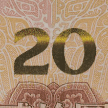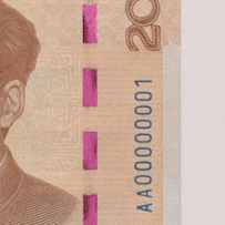 正面中部面额数字分别调整为光彩光变面额数字“20”、“10”,取消全息磁性开窗安全线,调整左侧胶印对印图案,右侧增加光变镂空开窗安全线和竖号码。