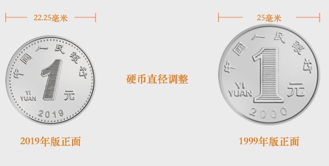 2019年版第五套人民币1元硬币保持1999年版第五套人民币1元硬币外形、外缘特征、“中国人民银行”行名、汉语拼音面额、人民币单位、花卉图案、汉语拼音行名等要素不变,调整了正面面额数字的造型,背面花卉图案适当收缩。直径由25毫米调整为22.25毫米。正面面额数字“1”轮廓线内增加隐形图文“?”和“1”,边部增加圆点。材质保持不变。