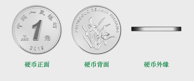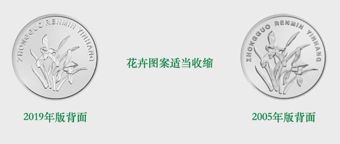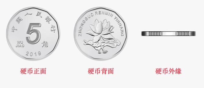 2019年版第五套人民币1元、5角、1角硬币分别保持1999年版第五套人民币1元、5角硬币和2005年版第五套人民币1角硬币外形、外缘特征、“中国人民银行”行名、汉语拼音面额、人民币单位、花卉图案、汉语拼音行名等要素不变,调整了正面面额数字的造型,背面花卉图案适当收缩。
