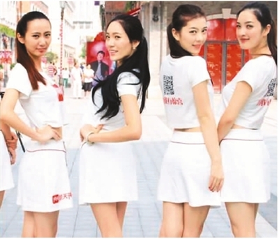 2013年9月,湖北武汉一家公司组织几位女士身着印有该公司二维码的文化衫在街头走秀,向公众推介。 |