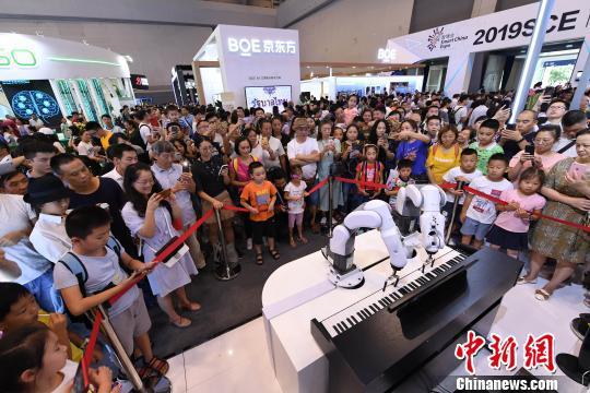 图为机器人弹钢琴吸引观众围观。 陈超 摄