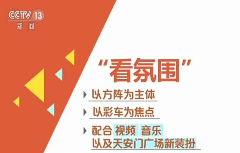 第二个亮点“看彩车”。十一白天的群众游行活动使用的彩车,设计选用的是“生动传神、便于理解的人物形象”等载体,而且还将传统文化与现代艺术充分结合,具有很强的现代感;不过到底会出现什么形象,彩车会变换哪些造型,我们也拭目以待。