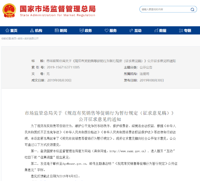 为了规范有奖销售等促销行为,维护公平竞争的市场秩序,保护消费者、经营者合法权益,根据《中华人民共和国反不正当竞争法》《中华人民共和国价格法》《中华人民共和国消费者权益保护法》等法律和行政法规,市场监管总局起草了《规范有奖销售等促销行为暂行规定》。现将征求意见稿向社会公开征求意见。公众可通过以下方式反馈意见: