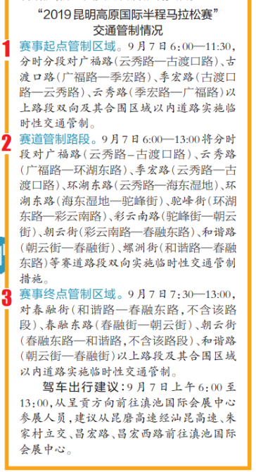 “2019昆明高原国际半程马拉松赛”将于9月7日在昆明市举行,为期半天。届时,昆明市安全部门和交通部门将对部分地区实施临时性交通管制,请观展市民提前规划调整出行路线、安排出行时间,避开交通管制路段,防止因交通管制影响参展。
