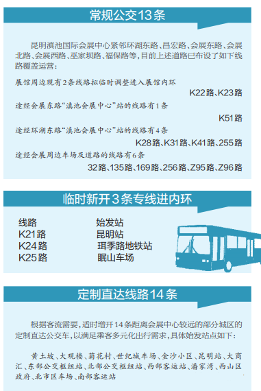 第十五届中国昆明国际农业博览会于9月5日至9日在滇池国际会展中心召开。为保障广大市民顺利出行,本次展会将开通30条公交线路,分别是常规公交13条和临时新开专线3条进入展馆内环,临时新开定制直达线路14条进入展馆内环。