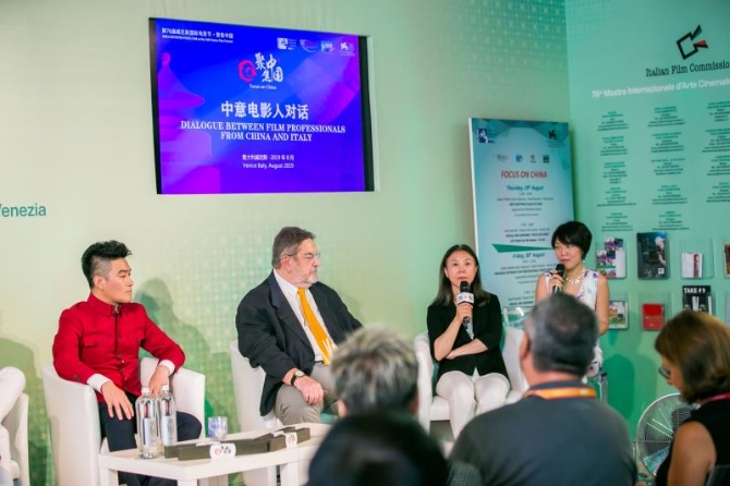 8月29日,第76届威尼斯电影节“聚焦中国”活动中意电影人对话环节在威尼斯举行。中国青年导演樊昊仑(左1)和上海电影学院副教授曲丽萍(右2)等嘉宾在活动上对话。