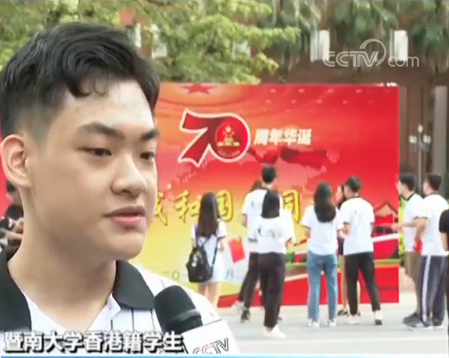 暨南大学香港籍学生:我觉得我们这些年轻的大学生就更应该为祖国贡献一点(力),哪怕是微不足道的事情也好,就是希望我们能跟祖国一起共奋进、共进退、共同地进步,希望我们每个人在国家里面都可以变得越来越好。