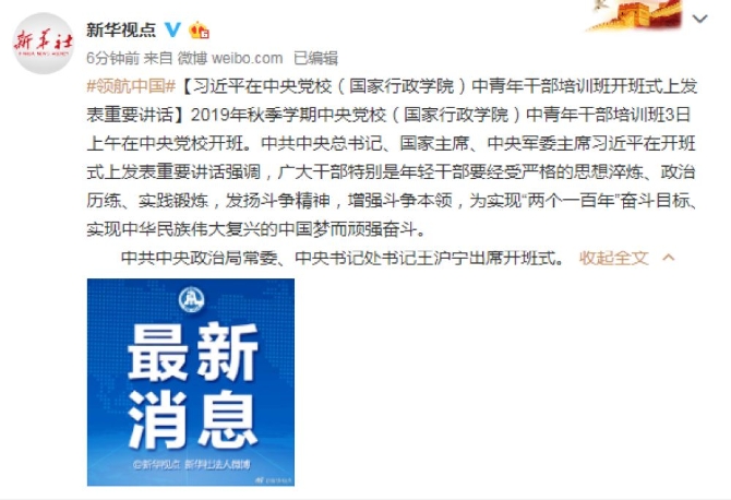 2019年秋季学期中央党校(国家行政学院)中青年干部培训班3日上午在中央党校开班。中共中央总书记、国家主席、中央军委主席习近平在开班式上发表重要讲话强调,广大干部特别是年轻干部要经受严格的思想淬炼、政治历练、实践锻炼,发扬斗争精神,增强斗争本领,为实现“两个一百年”奋斗目标、实现中华民族伟大复兴的中国梦而顽强奋斗。