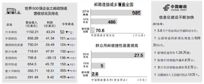 中国邮政抓住国家深化邮政体制改革的机遇,坚持科技兴邮,推行专业化经营、多元化发展,极大地解放和发展了生产力,实现了跨越式发展。2011年,中国邮政首次登上世界500强排行榜,当时的排名是第343位,今年已跃升至101位,共提升242个名次。2018年,中国邮政总营业收入为856.28亿美元,同比增长16.2%,邮务板块创新发展、金融板块健康发展、寄递板块转型发展。