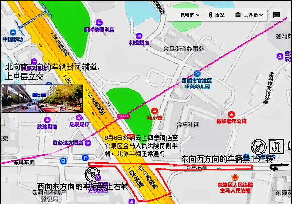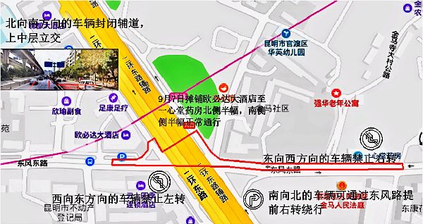 云上四季酒店至官渡区人民法院金马法院施工期间绕行方式如下:①东风路西向东方向的车辆可提前右转环城东路;②东向西方向的车辆禁止左转,可提前掉头至金马路;③南向北的车辆可通过二环东路辅道右转东风路;④北向南的车辆可提前通过二环东路中层立交进行绕行。