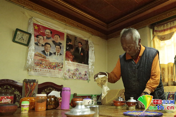 扎西正在整理家务。中国青年网记者 张瑞玲 摄