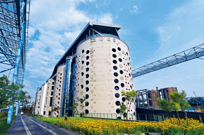 西十筒仓位于新首钢高端产业综合服务区北侧,原为首钢炼铁厂用于存储炼铁原料的筒形料仓。筒仓改造保留了外立面风貌,在筒仓壁开洞采光,同时加建钢结构楼板,在两筒之间新建景观电梯。改造既保留了原有的建筑风貌特色,又赋予了它新的功能和生命。经过改造,筒仓建筑已成为八层的写字楼。图为改造后的西十筒仓。 北京市发改委供图