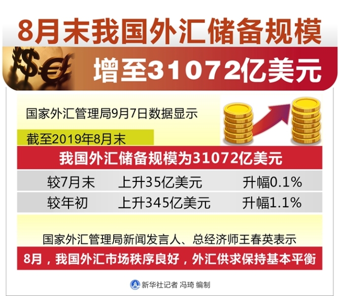 新华社北京9月7日电 记者刘开雄 国家外汇管理局7日数据显示,截至2019年8月末,我国外汇储备规模为31072亿美元,较7月末上升35亿美元,升幅0.1%;较年初上升345亿美元,升幅1.1%。
