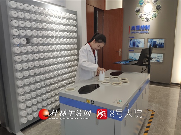 在中国中药(桂林)产业园已经完工的展示厅内,工作人员正在演示使用中药配方颗粒智能调配系统