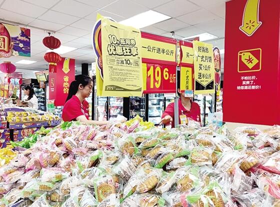 在月饼专区,一家现烤现卖的月饼格外惹市民青睐。“我们是常年卖云腿小饼,原价是88元/公斤,从这个周开始降到69.8元/公斤,等过完中秋节就恢复原价。”颜女士告诉记者,这几天买月饼的人特别多,一天能卖出100多公斤。记者在家乐福等超市、商场看到,类似的促销活动正如火如荼地开展。