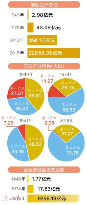 1949年,广州地区生产总值仅为2.98亿元,人均地区生产总值仅为121元。到2018年,广州地区生产总值达22859.35亿元;人均地区生产总值达15.55万元。新中国成立70年来,广州以敢为人先的精神在改革开放和社会主义现代化建设中始终屹立潮头,实现了从“赶上时代”到“引领时代”的伟大跨越,经济社会建设的各个领域发生了翻天覆地的变化。