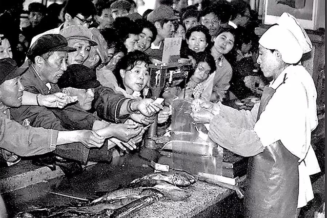 在计划经济时期,大多数商品都是凭票供应。这是那个年代,老百姓在凭票排队买鱼。 (资料图片)