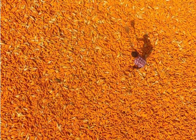 2018年9月6日,山东省聊城市茌平县贾寨镇耿三庄村,村民在晾晒玉米。(新华社图)