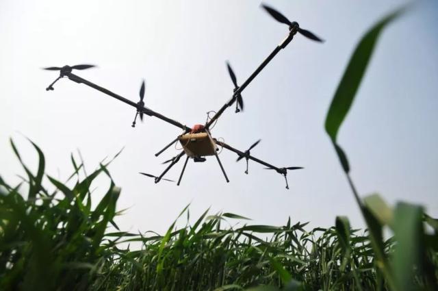2018年5月3日,无人机在泊头市齐桥镇大付村麦田里进行喷药作业。(新华社记者牟宇 摄)