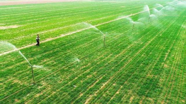 2019年3月19日,河北省枣强县新屯镇西黄甫村农民使用喷灌设备灌溉麦田。(新华社记者李晓果摄)