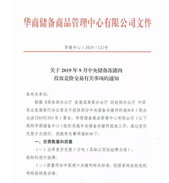 9月17日,华商储备商品管理中心发布通知称,根据相关部委的要求,组织实施中央储备冻猪肉1万吨投放工作,将通过竞价交易的方式进行。