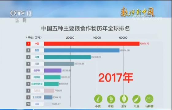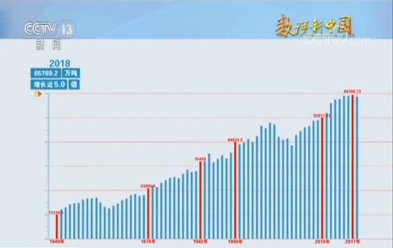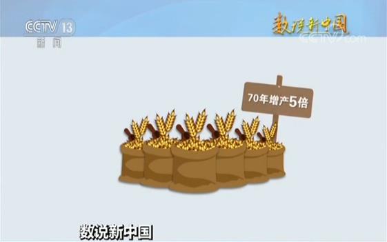 如果把1949年的粮食产量作为基础,在播种面积变化不大的情况下,我国70年粮食年产量增长5倍。