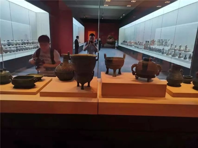 图为展览中的曾伯克父青铜组器。 本报记者 张雪 摄