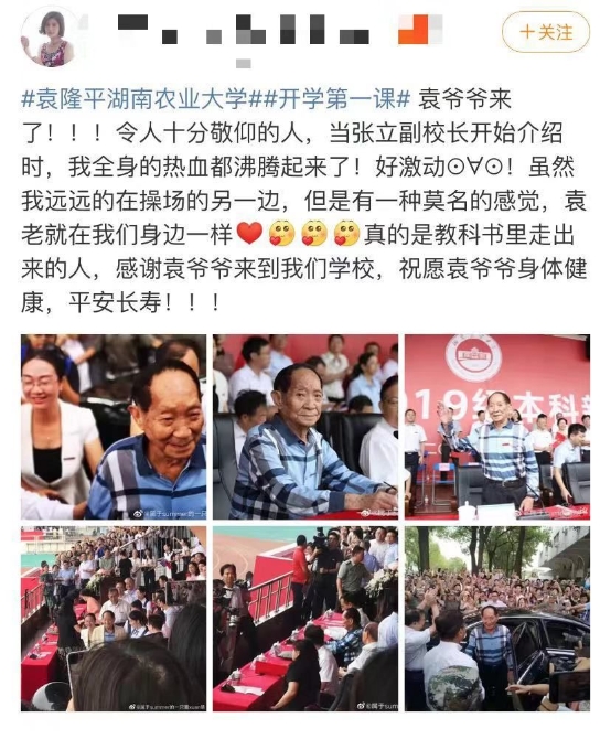 刚刚在9月7日度过90岁生日的杂交水稻育种专家、中国工程院院士袁隆平,9月16日应邀参加湖南农业大学的开学典礼并致辞。在袁隆平到达现场的前后和开学典礼期间,学生们欢呼尖叫,上演“大型追星现场剧”。
