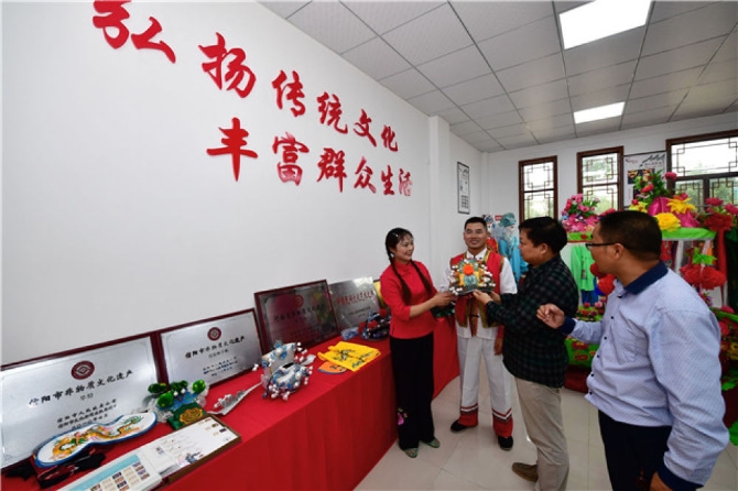 在信阳市光山县文殊乡东岳村,村民在村文化中心查看演出道具(9月17日摄)。新华社记者 冯大鹏 摄