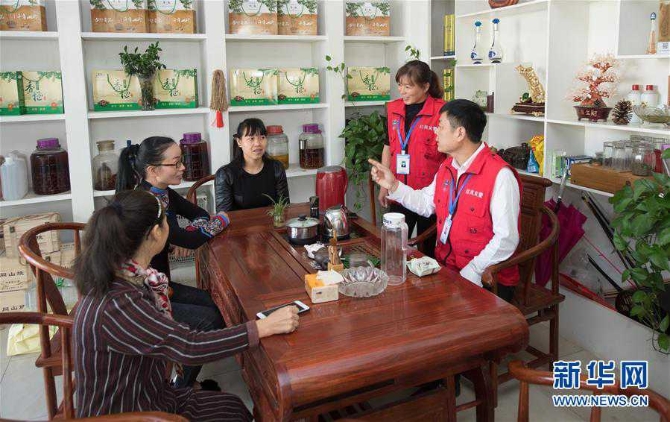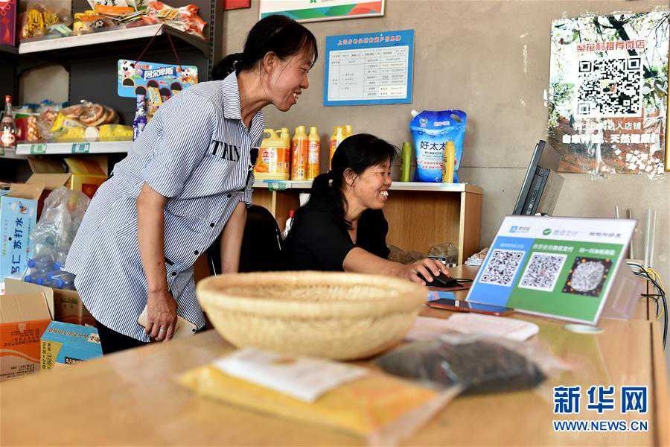 在山西省武乡县岭头村便民服务站,村民张晓英(右)和李润红在交流微店销售情况和产品推销办法(2018年7月5日摄)。 新华社记者 詹彦 摄