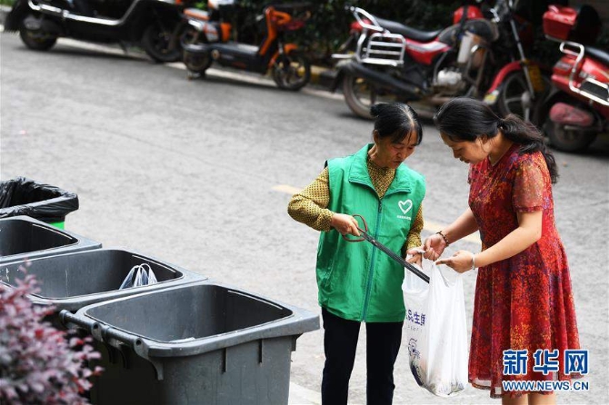 7月4日,重庆市江北区和韵家园社区的垃圾分类志愿者(左)协助居民进行垃圾分类投放。 新华社记者 王全超 摄