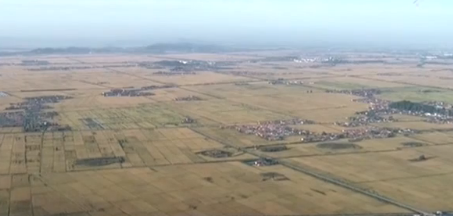 辽宁省东港市沿海水稻种植田东临鸭绿江、南临黄海,独具沿江、沿海、沿边临港的独特地理环境。每逢秋天,丰收形成的金黄色和大海的蔚蓝色遥相呼应,再加上蜿蜒流转的河流,形成独特的金秋画卷。