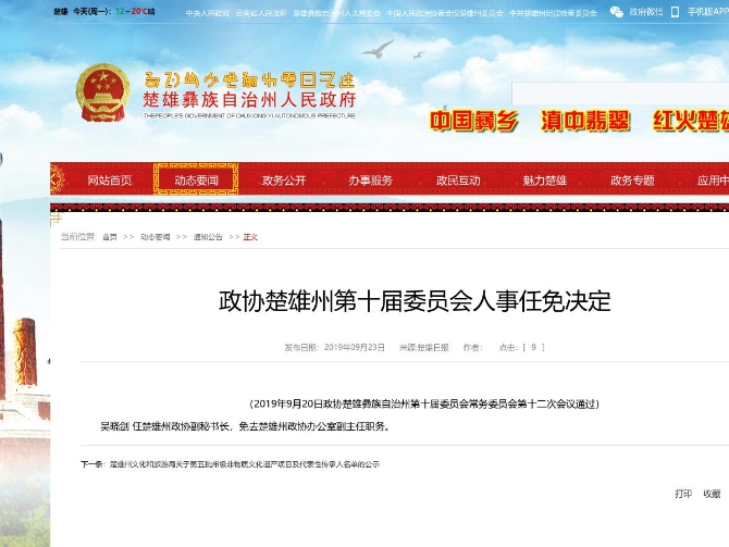 昆明信息港讯 机器人小明 9月20日政协楚雄彝族自治州第十届委员会常务委员会第十二次会议通过人事任免决定,任吴晓剑为楚雄州政协副秘书长,免去其楚雄州政协办公室副主任职务。(本文由昆明信息港写稿机器人小明根据楚雄州政府网站网站数据自动合成发布)