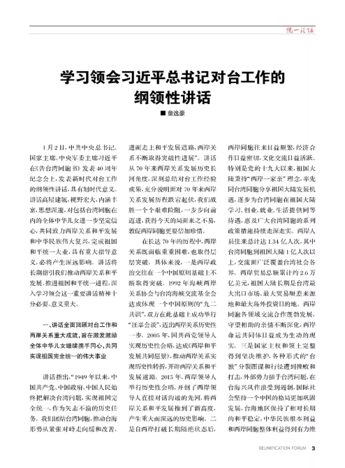 《统一论坛》刊登重要文章三十年来,《统一论坛》杂志宣传大陆对台方针政策,开展两岸交流,关注岛内“台独”势力动向,充分发挥舆论宣传阵地和思想交流园地作用,成为广大读者了解大陆对台方针政策和两岸局势变化、交流爱国思想和统一见解的平台。