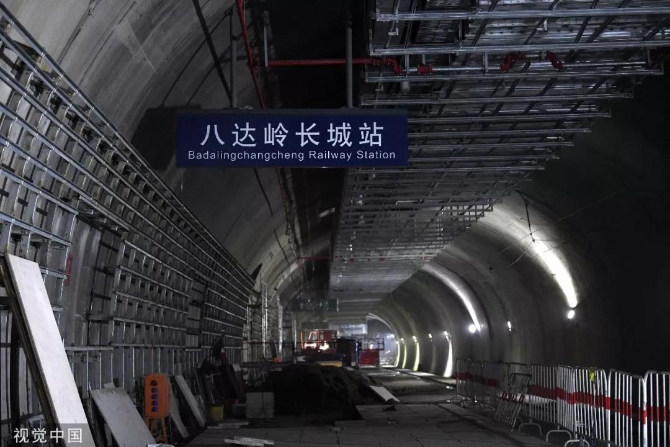 八达岭长城站轨面位于地下102米处,是目前国内埋深最大的高速铁路地下车站。