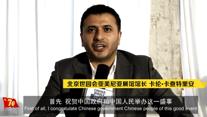 北京世园会亚美尼亚展馆馆长卡伦•卡查特里安表示,中国开始在世界上扮演重要的角色,很多国家希望与中国建立良好的文化和经济方面的联系。祝福新中国70周年生日快乐!