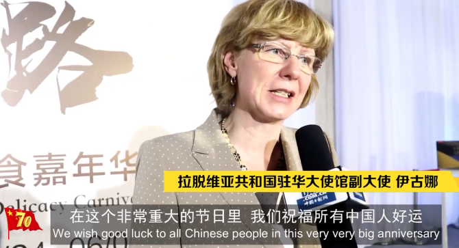 拉脱维亚共和国驻华大使馆副大使祝福所有中国人在这么重大的节日中好运。她表示,今年是拉脱维亚与中国建交27周年,感谢中国一直以来对拉脱维亚的支持。她不知道用中文怎么说生日快乐,但是她想说:“我爱你,中国!”