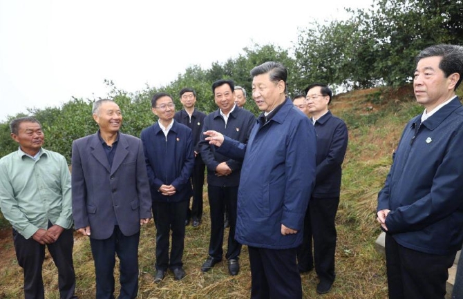 油茶园迎来了一位贵客。习近平总书记冒着小雨走进万亩油茶园,同正在劳作的村民们亲切交流,细致询问怎么出工、工资多少、生活怎样。村民回答说现在脱贫了,生活天天像过年,习近平连声说好。习近平强调,种油茶绿色环保,一亩百斤油,这是促进经济发展、农民增收、生态良好的一条好路子。路子找到了,就要大胆去做。要通过“公司加农户”的方式,朝着市场化、规模化的方向发展,使公司和农民都受益。