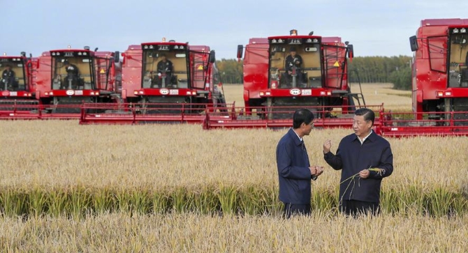 △2018年9月25日,习近平来到黑龙江省七星农场万亩大地号了解生产全程机械化情况。