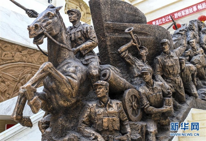 这是在新疆生产建设兵团第六师五家渠市博物馆内展出的大型雕塑《军垦魂》(7月31日摄)。新华社记者 王菲 摄