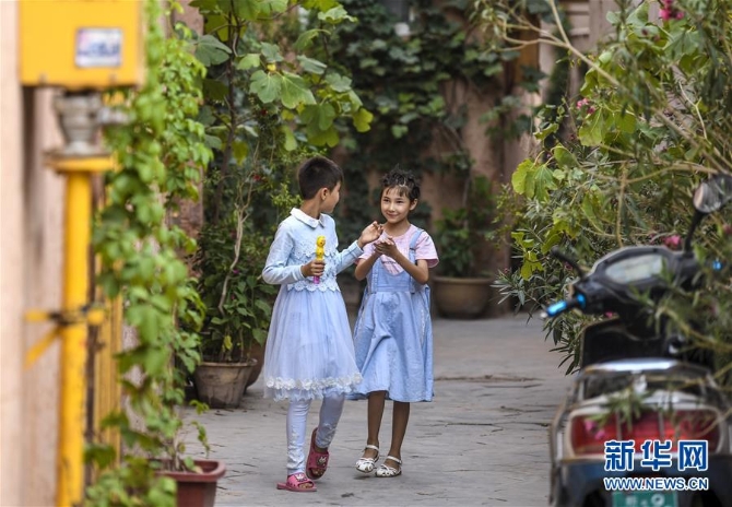 在新疆喀什古城景区内,当地两名小朋友走在巷道内(8月12日摄)。新华社记者 王菲 摄