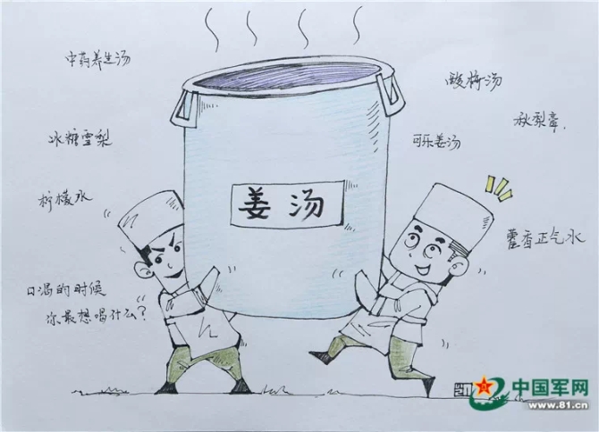 “口渴的时候,你最想喝什么?”“悦兵凉茶、中药养生汤、可乐姜汤、酸梅汤……”画上,两名炊事员双手举着一大桶姜汤送上训练场。原来,为了让官兵充分补充水分,方队军医针对队员肺火偏旺,出现流鼻血、易上火等症状,用菊花、连翘、栀子等中药材配制出“悦兵凉茶”。训练后期,针对队员进入疲劳期,军医又将凉茶进行改良,增加预防秋燥等药材,以补气养血为主,增强免疫力,缓解疲劳,凉茶一经推出,官兵交口称赞,并誉为阅兵场上的“振气汤”!
