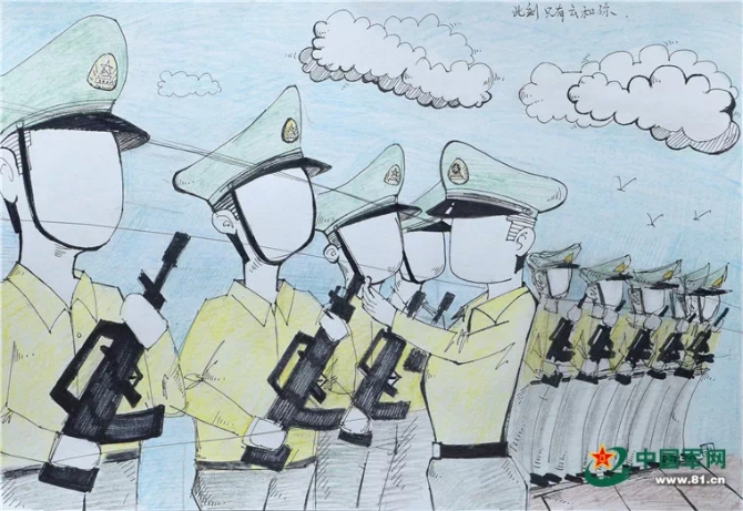 走进阅兵集训点,杭瑞凯把目光锁定训练场和官兵生活点滴。有一天,方队组织枪支维护保养,队员耗时2个小时,专心致志地把枪支擦得铮亮。看着战友的认真劲,他突发奇想,迅速拿出画笔勾勒出大概轮廓:两个战友一唱一和、一问一答,画面瞬间活跃起来。