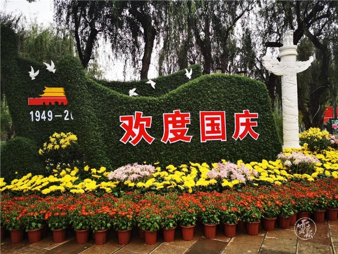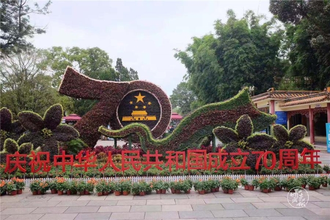 进入公园大门,映入眼帘的就是新中国成立70周年logo,造型高4.4米,宽11.6米,用五色草以及各种时令花卉制作完成,和平鸽与上万朵鲜花做成的彩带簇拥着国徽,象征者中华儿女紧紧围绕着祖国,祝愿祖国繁荣昌盛。