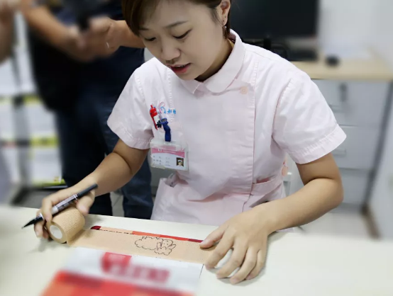 董清已经做了 11年儿科护士,画画是她的业余爱好。提到在绷带上画画的创意,董清说:“儿科都是一些小朋友,平时沟通比较困难,遇上不配合治疗的患儿,护理技术再精湛也难以施展。为了吸引孩子的注意力,让他们不排斥滞留针,我突发奇想把画画的爱好,用在了‘哄娃’上,没想到效果还不错。”