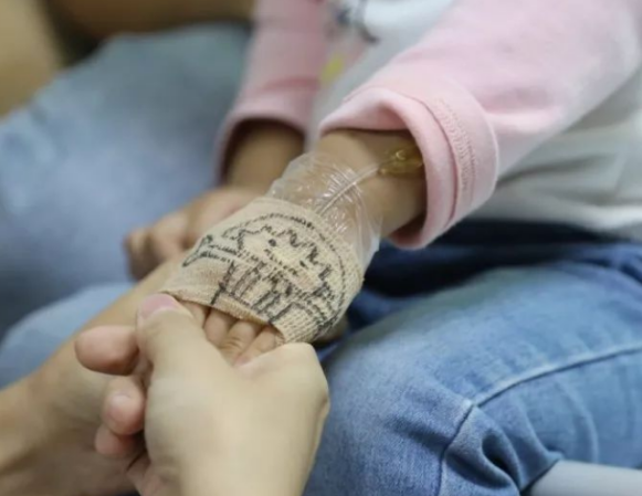 今年3岁的小草莓,几天前因肺炎住进了儿科。因为小女孩比较怕疼,为了不让小草莓乱动留置针的针头,董清为她缠上了画有樱桃小丸子和小草莓的自粘绷带。