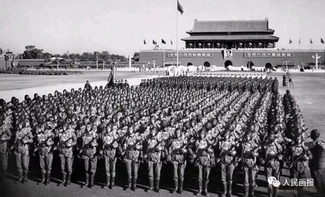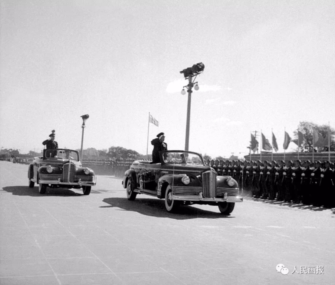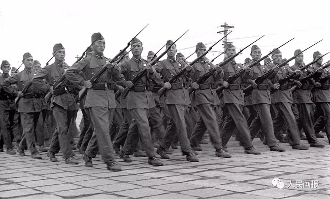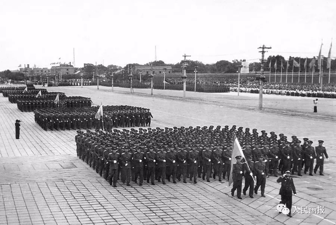 这是我军实行军衔制后的第一次阅兵。部队官兵穿着崭新的制式军服,佩戴军衔、领章,军容焕然一新。一位38岁的少将被挑选担任阅兵部队领队。彭德怀元帅身着崭新的礼服在杨成武上将的陪同下检阅了陆海空三军,周总理说:此举向全世界宣布,中国人民解放军结束了有军无将的历史!(摄影:谈培章、邹健东)