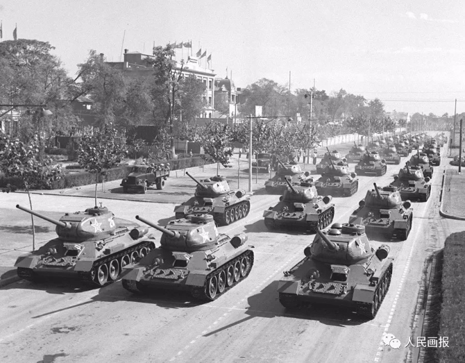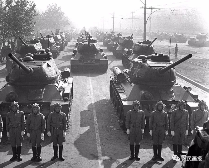 中国人民解放军海陆空三军第一次公开亮相。受阅部队装备几乎全部是战争中缴获的,号称“万国牌”。为防止敌机袭击,人民空军的飞机是带弹受阅。(摄影:吴群、孟昭瑞、石少华)