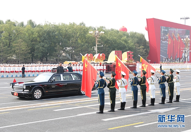 10月1日,庆祝中华人民共和国成立70周年大会在北京天安门广场隆重举行。这是中共中央总书记、国家主席、中央军委主席习近平检阅受阅部队。 新华社记者 燕雁 摄